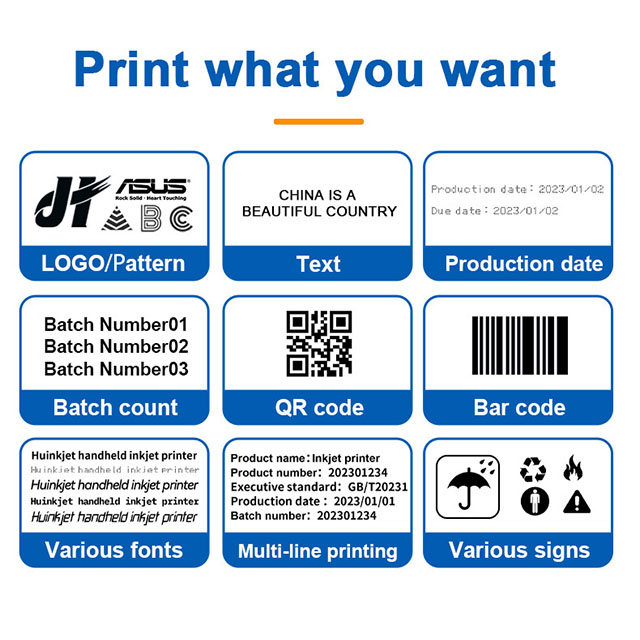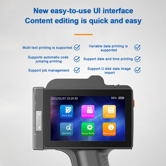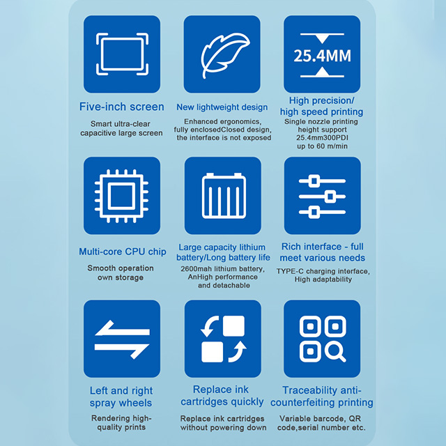 Handheld Inkjet Printer adalah solusi portabel untuk kebutuhan pencetakan seperti kode produksi, tanggal kedaluwarsa, barcode, atau logo pada berbagai jenis permukaan. Dengan desain ringan dan ergonomis, printer ini dilengkapi layar sentuh HD berukuran 5 inci yang mempermudah pengoperasian. Berikut adalah beberapa fitur dan spesifikasi utama dari mesin ini.